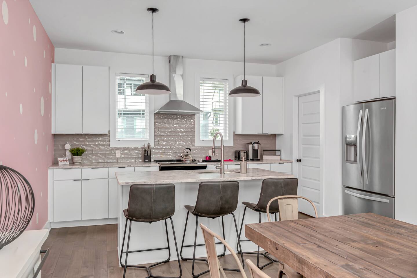 All the fun that music city has to offer is just a quick uber ride away! - Broadway (11min - 3.9mi) - The Gulch (13 min) -Germantown (8 min) -Nissan Stadium (6 min -2.3mi) * 3 bedrooms * 3 Bathrooms * Fully stocked kitchen w bar seating * Spacious living room * Washer/Dryer * Two car garage & Two car driveway parking & Limited street parking * Smart TV's/WiFi * beer pong game in garage * Early bag drop off upon request * Early/Late check in/out upon request at $50 * PET friendly ! $150 There are three levels in the house with 15-20 stairs between each level (some older guests complained before that the stairs maybe too steep for the elderly) Level 1 Bedroom 1 - 2 full beds 2 car garage Level 2 Kitchen, living and dining space Sofa Bed and queen Murphy bed Full bath accessible to living space Level 3 Bedroom 2 - Queen bed, two single bunk beds with private attached full bath and private balcony Bedroom 3 - Queen bed with private attached full bath and private balcony If you have more than two cars, please message me and I will send you links of other Dolly units with more driveway parking